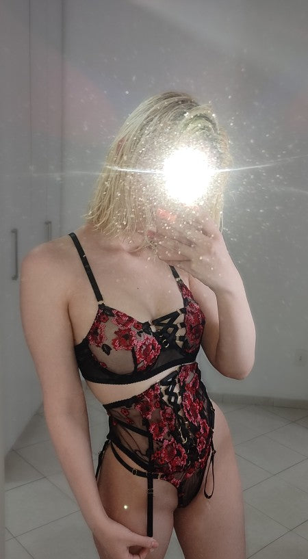 Provocative design Immerse yourself in the sensual radiance of the DISTANCE set. This red floral lace set evokes boldness and passion, with an underwired bra, a shaping suspender belt, a matching thong and thigh loops that irresistibly highlight your figure.